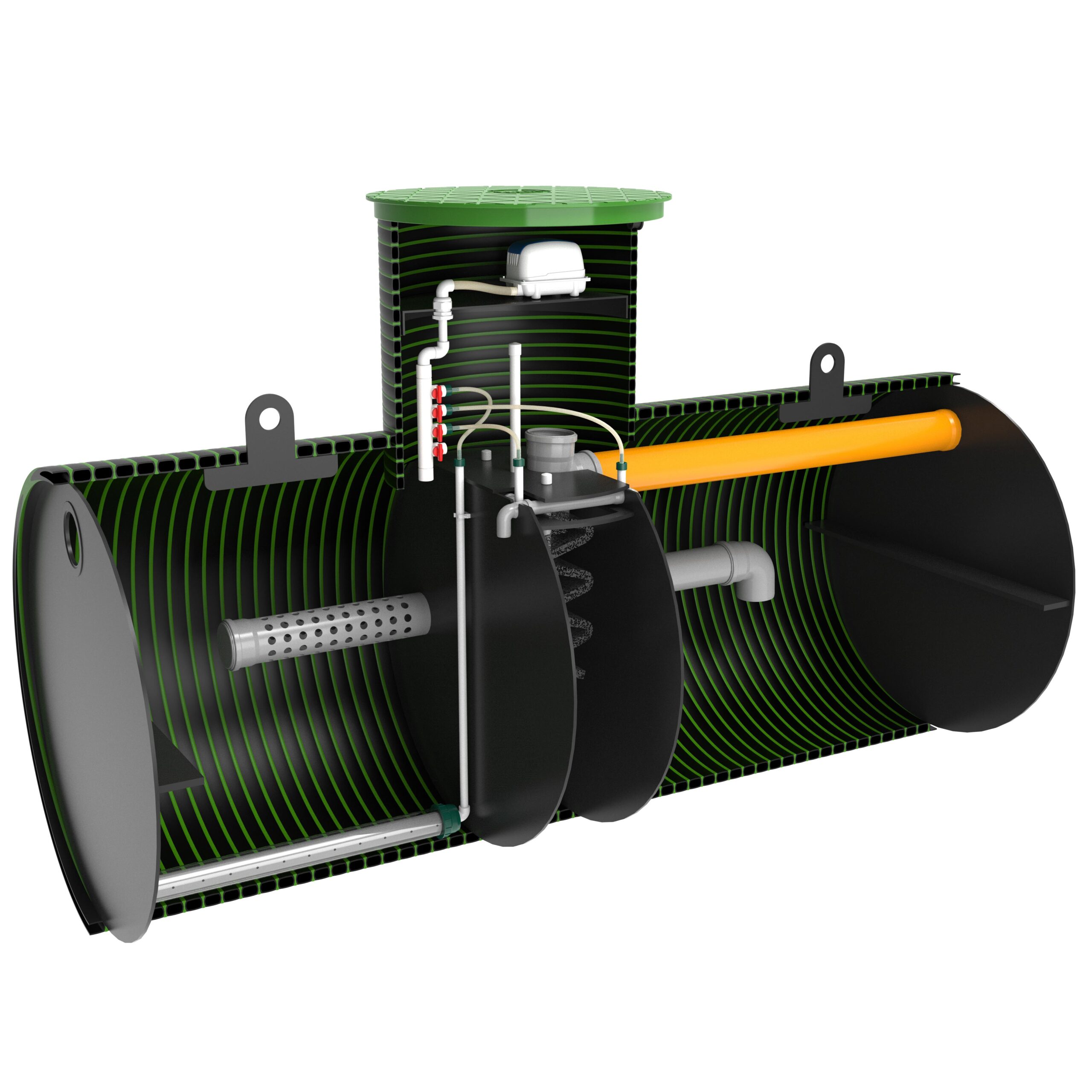Горизонтальная станция биологической очистки KANN серии ULTRA имеет производительность от 1000 до 3000 л/сутки и рассчитана на количество проживающих от 4 до 15 человек. Принцип работы станции основан не мелко-пузырчатой аэрации, которую создает аэрационная установка, поставляемая в комплекте. За счет подачи воздуха в станцию, а также дополнительных механизмов очистки происходит полная очистка стоков до уровня 98%. Полученная на выходе вода не имеет запаха, прозрачна и бесцветна. Такую воду можно дренировать в грунт.